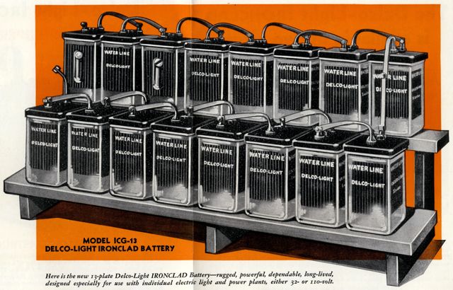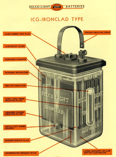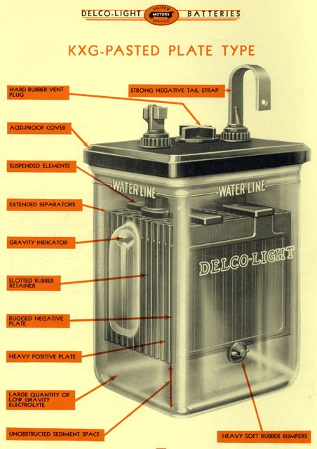 When brand new Delco-Light Plants were delivered it was the responsibility of the customer to have a battery rack already built. The step type (shown) and shelf type consisted of two platforms 9" deep and 5'9" long built from 1 1/2" thick boards. They were sometimes painted with black asphaltum paint to protect the wood from battery acid. These original racks can still be found in basements and barns still in use but serving another purpose. Light Plant Batteries are usually found with the covers and plates missing. Complete batteries are rare, and should be handled with care to avoid acid spills/burns.