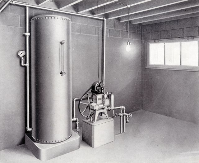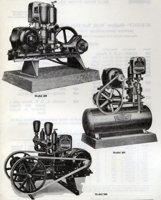 The Model 200, 400 and 800 series belt driven pumps were built from 1926 to 1933. During this era model numbers were assigned much the same way as light plants were - the model number indicated the capacity in gallons per hour of the pump. Early water systems came with a basic steel tank that could be upgraded to either an enameled or galvanized tank.