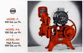 Models A-AH were powered by either a 1/6 (standard) or 1/4 (high pressure) horsepower motor and were very widely used. All Delco pumps from this era were finished in Romany Red enamel.